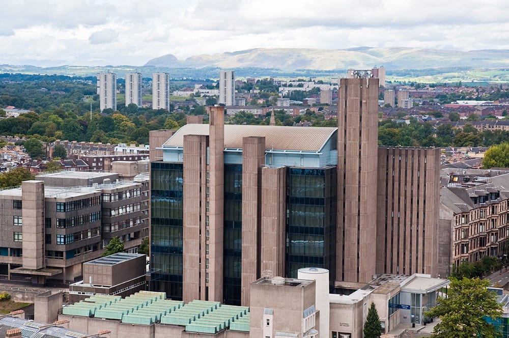 Glasgow University’s library is housed in a tower block that was constructed in 1968, and is the centrepiece of an extensive post-war sprawl that constitutes the university’s Hillhead campus. The building is a twelve-storey high slab of concrete brutalism, which has its services housed in separate, adjacent towers. It is situated close to the peak of the hill that runs down past the university’s more recognisable neo-Gothic Gilbert Scott building, through Kelvingrove Park, to the banks of the river Clyde.