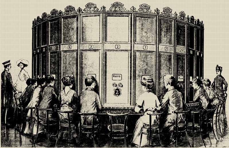 The Kaiserpanorama worked in the same fashion: stereoscopic images arranged around a circular, rotating device. The big difference was one of scale, and this gave the Kaiserpanorama its advantage, for while my View-Master was a solitary occupation, Fuhrmann conceived of his device as a spectacle for the masses, capable of entertaining up to twenty-five people at any one time.